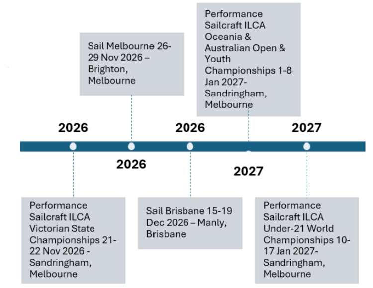 The 2027 event will be held at Sandringham YC Vic 1-8 January 2027 which will be followed at the same club by the ILCA U21 World Championship 10-17 January.